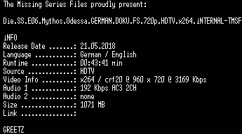 | FiLENAME: | Die.SS.E06.Mythos.Odessa.GERMAN.DOKU.FS.720p.HDTV.x264.iNTERNAL-TMSF.mkv |