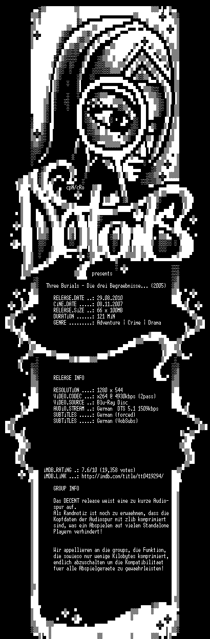 | FiLENAME: | Three Burials - Die drei Begraebnisse des Melquiades Estrada (2005) [GER-dts 720p BD].mkv |