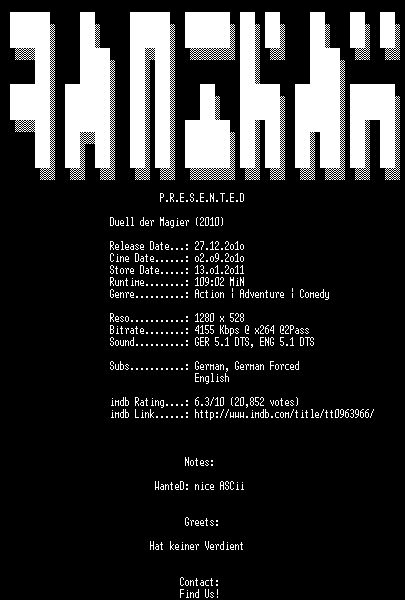 | FiLENAME: | Duell der Magier (2010) [DL-dts 720p BD].mkv |