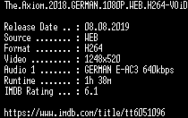 | FiLENAME: | The.Axiom.2018.GERMAN.1080P.WEB.H264-VOiD.mkv |
