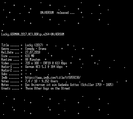 | FiLENAME: | Lucky.GERMAN.2017.AC3.BDRip.x264-UNiVERSUM.mkv |