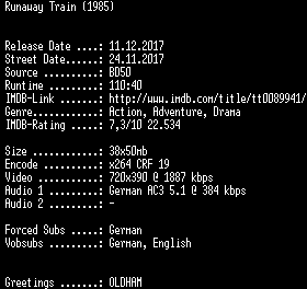 | FiLENAME: | Express.in.die.Hoelle.German.REMASTERED.1985.AC3.BDRip.x264-SPiCY.mkv |