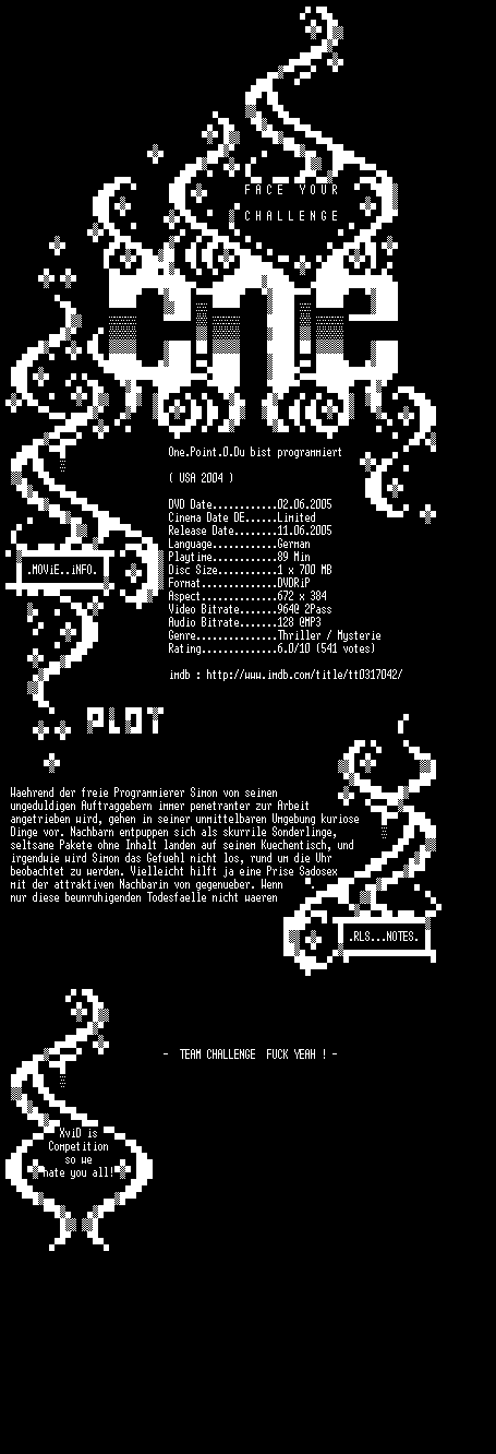 | FiLENAME: | One.Point.Zero.GERMAN.2004.DVDRiP.XviD-CHALLENGE.avi |