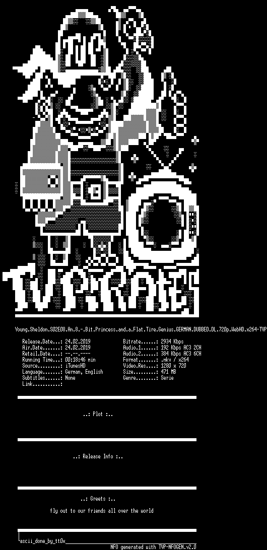 | FiLENAME: | Young.Sheldon.S02E08.An.8.-.Bit.Princess.and.a.Flat.Tire.Genius.GERMAN.DUBBED.DL.720p.WebHD.x264-TVP.mkv |
