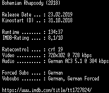| FiLENAME: | Bohemian.Rhapsody.German.2018.AC3.BDRip.x264-COiNCiDENCE.mkv |
