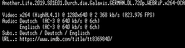 | FiLENAME: | Another.Life.2019.S01E01.Durch.die.Galaxis.GERMAN.DL.720p.WEBRiP.x264-OCA.mkv |