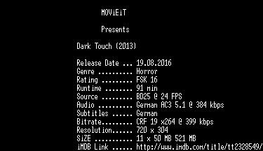 | FiLENAME: | Dark.Touch.German.2013.AC3.BDRip.x264-MOViEiT.mkv |