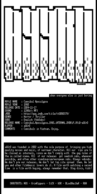| FiLENAME: | Cannibal.Apocalypse.1980.iNTERNAL.DVDRiP.XViD-aGGr0.avi |