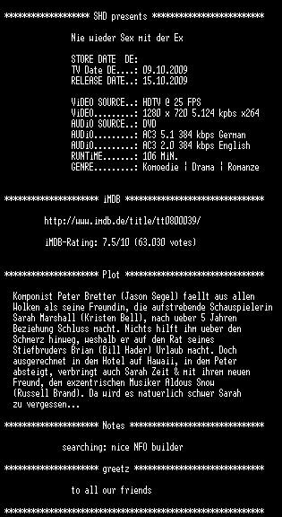 | FiLENAME: | Nie wieder Sex mit der Ex (2008) [DL 720p HDTV].mkv |