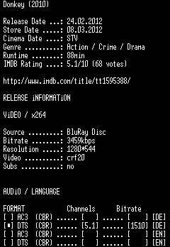 | FiLENAME: | Donkey.2010.German.720p.BluRay.x264-OBLiGATED.mkv |