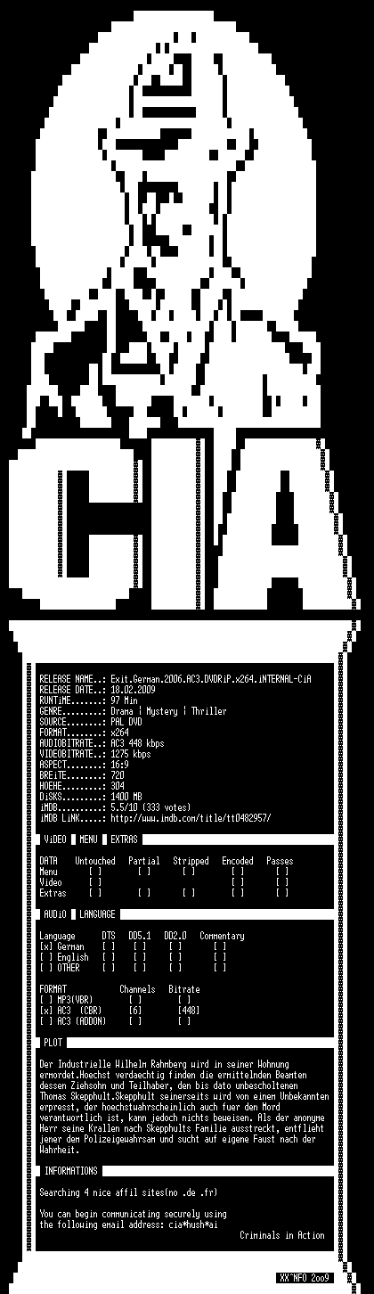 | FiLENAME: | Exit.German.2006.AC3.DVDRiP.x264.iNTERNAL-CiA.mkv |