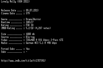 | FiLENAME: | Lovely.Molly.German.2011.AC3.BDRiP.XViD-EXQUiSiTE.avi |