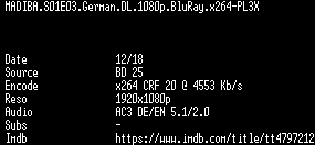 | FiLENAME: | MADIBA.S01E03.German.DL.1080p.BluRay.x264-PL3X.mkv |