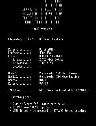 | FiLENAME: | Elementary.S06E12.Goldenes.Handwerk.GERMAN.DUBBED.DL.720p.WebHD.h264-euHD.mkv |