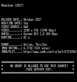 | FiLENAME: | Wheelman.2017.German.720p.WebHD.x264-SLG.mkv |