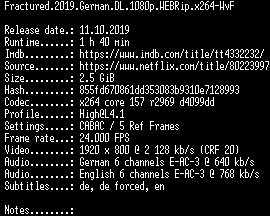 | FiLENAME: | Fractured.2019.German.DL.1080p.WEBRip.x264-WvF.mkv |