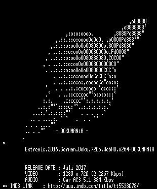 | FiLENAME: | Extremis.2016.German.Doku.720p.WebHD.x264-DOKUMANiA.mkv |