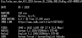 | FiLENAME: | Die.Farbe.aus.dem.All.2019.German.DL.2160p.UHD.BluRay.x265-HDMEDiA.mkv |