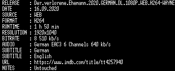 | FiLENAME: | Der.verlorene.Ehemann.2020.GERMAN.1080P.WEB.H264-WAYNE.mkv |