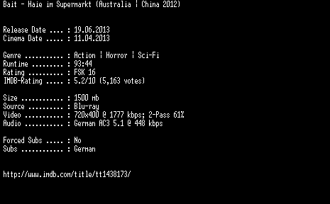 | FiLENAME: | Bait.Haie.im.Supermarkt.German.2012.AC3.BDRip.XviD-EXQUiSiTE.avi |