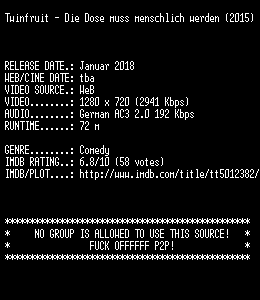 | FiLENAME: | Twinfruit.Die.Dose.muss.menschlich.werden.2015.German.720p.WebHD.x264-SLG.mkv |