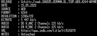 | FiLENAME: | Schitts.Creek.S06E05.GERMAN.DL.720P.WEB.X264-WAYNE.mkv |