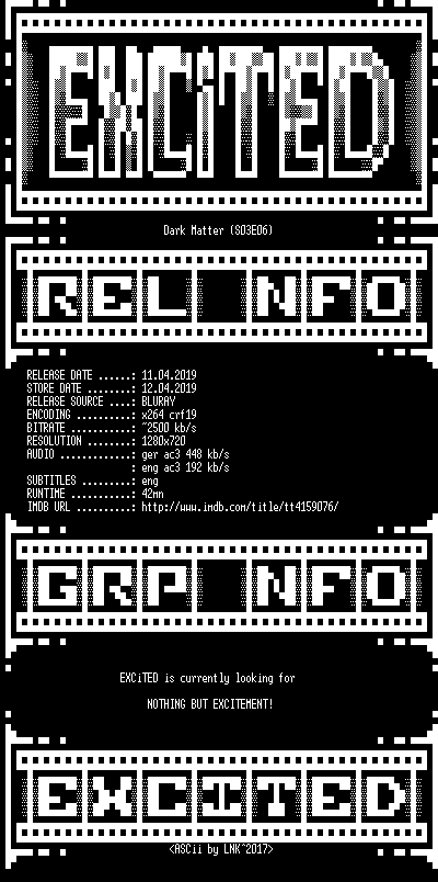 | FiLENAME: | Dark.Matter.S03E06.German.DL.720p.BluRay.x264-EXCiTED.mkv |