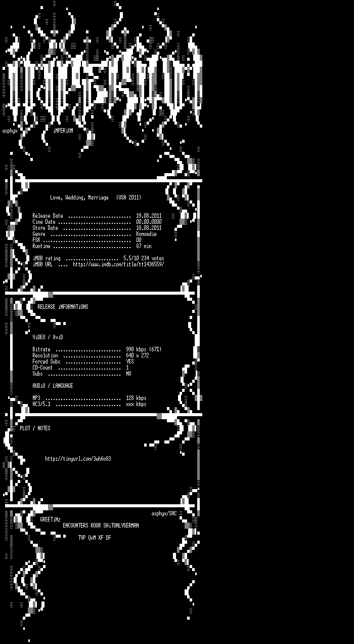 | FiLENAME: | Love.Wedding.Marriage.German.2011.DVDRip.XviD-iMPERiUM.avi |