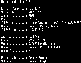 | FiLENAME: | Mittwoch.04.45.German.2015.AC3.BDRip.x264-SPiCY.mkv |