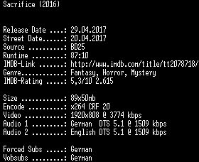 | FiLENAME: | Sacrifice.2016.German.DL.1080p.BluRay.x264-SPiCY.mkv |
