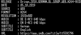 | FiLENAME: | Driven.2018.GERMAN.DL.1080P.WEB.H264-VOiD.mkv |