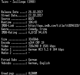| FiLENAME: | Twins.Zwillinge.German.REMASTERED.1998.AC3.BDRip.x264-SPiCY.mkv |