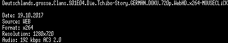 | FiLENAME: | Deutschlands.grosse.Clans.S01E04.Die.Tchibo-Story.GERMAN.DOKU.720p.WebHD.x264-MOUSECLiCK.mkv |