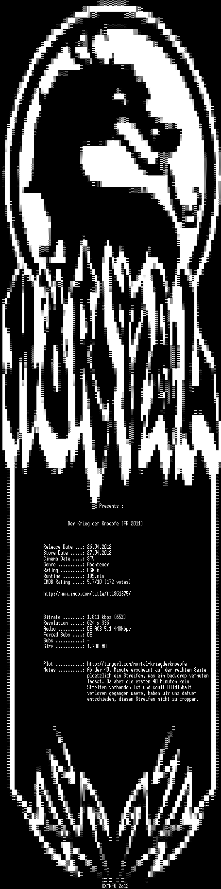 | FiLENAME: | Der.Krieg.der.Knoepfe.2011.READ.NFO.German.AC3.DVDRip.XviD-MORTAL.avi |