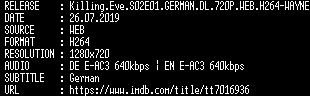| FiLENAME: | Killing.Eve.S02E01.GERMAN.DL.720P.WEB.H264-WAYNE.mkv |