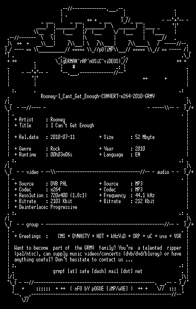 | FiLENAME: | Rooney-I_Cant_Get_Enough-CONVERT-x264-2010-GRMV.mkv |