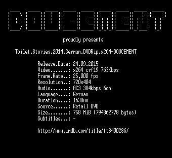 | FiLENAME: | Toilet.Stories.2014.German.DVDRip.x264-DOUCEMENT.mkv |