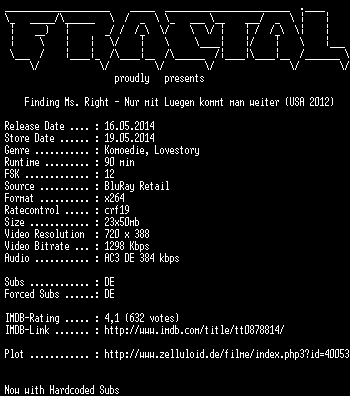 | FiLENAME: | Finding.Ms.Right.Nur.mit.Luegen.kommt.man.weiter.German.2012.AC3.BDRip.x264.RERiP-FRACTAL.mkv |