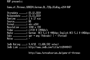 | FiLENAME: | Game.of.Thrones.S08E04.German.DL.720p.BluRay.x264-RWP.mkv |