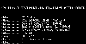| FiLENAME: | The.I-Land.S01E07.GERMAN.DL.HDR.1080p.WEB.h265.iNTERNAL-EiSBOCK.mkv |