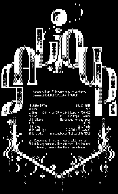 | FiLENAME: | Monster.High.Aller.Anfang.ist.schwer.German.2014.DVDRiP.x264-SAViOUR.mkv |