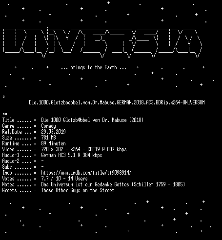 | FiLENAME: | Die.1000.Glotzboebbel.vom.Dr.Mabuse.GERMAN.2018.AC3.BDRip.x264-UNiVERSUM.mkv |