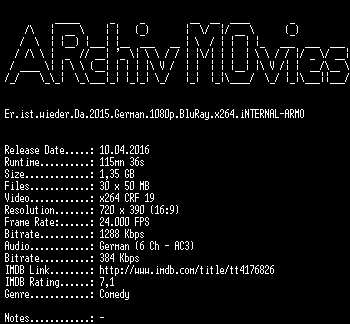 | FiLENAME: | Er.ist.wieder.Da.German.2015.AC3.BDRiP.x264.iNTERNAL-ARMO.mkv |