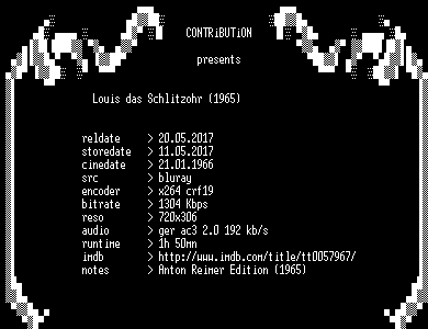 | FiLENAME: | Louis.das.Schlitzohr.ANTON.REiMER.SYNCHRONFASSUNG.1965.Remastered.German.BDRip.x264-CONTRiBUTiON.mkv |