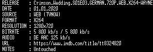 | FiLENAME: | Crimson.Wedding.S01E03.GERMAN.720P.WEB.X264-WAYNE.mkv |
