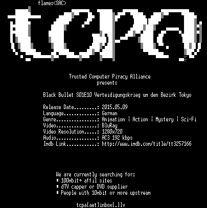 | FiLENAME: | Black.Bullet.S01E10.Verteidigungskrieg.um.den.Bezirk.Tokyo.German.Dubbed.ANiME.720p.BluRay.x264-TCPA.mkv |