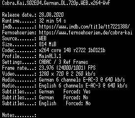 | FiLENAME: | Cobra.Kai.S02E04.German.DL.720p.WEB.x264-WvF.mkv |