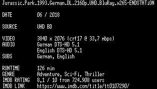 | FiLENAME: | Jurassic.Park.1993.German.DL.2160p.UHD.BluRay.x265-ENDSTATiON.mkv |
