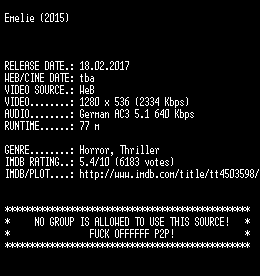 | FiLENAME: | Emelie.2015.German.720p.WebHD-x264-SLG.mkv |