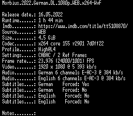| FiLENAME: | Morbius.2022.German.DL.1080p.WEB.x264-WvF.mkv |
